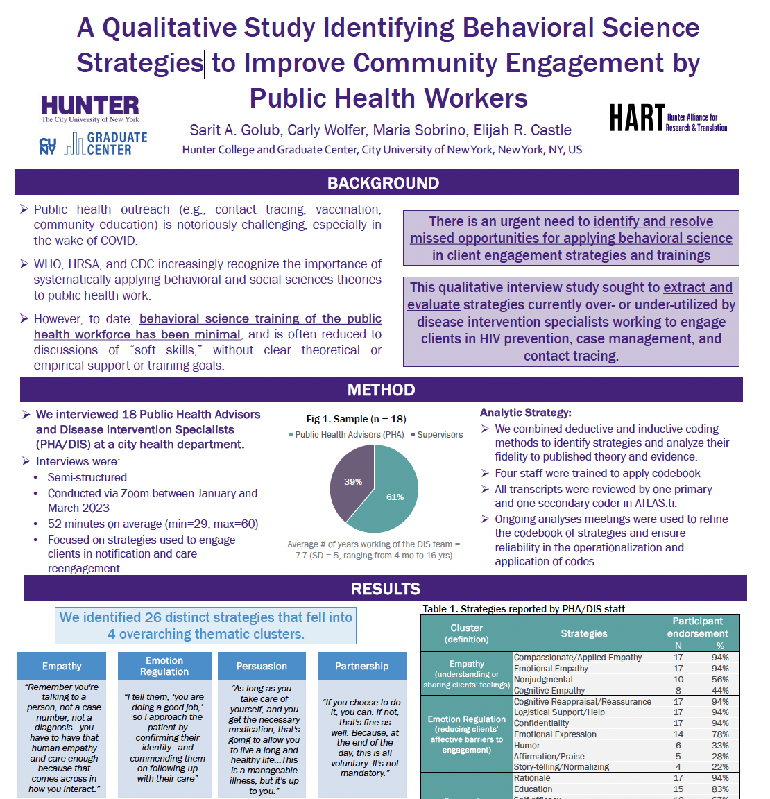 Citation: Golub, S.A. Wolfer, C., Sobrino, M, & Castle, E. (2025, March 27). A qualitative study ideintying behavioral science strategies to improve community engagement by public health wokrers, [Poster presentation]. Society for Behavioral Medicine 46th Annual meeting, San Francisco, CA.
